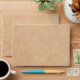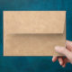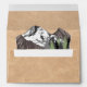 Elegant rustic wedding envelope featuring beautiful snow capped mountains and pine trees on the inside and a Kraft background on the outside.
