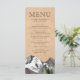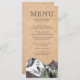 Elegant rustic wedding menu card featuring beautiful snow capped mountains and pine trees with modern typography against a Kraft background.
