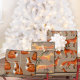 A holiday gift wrapping paper featuring a Kraft colour background with watercolour-painted red foxes, each sheet with a different fox in a repeat pattern.