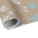 A Glossy kraft coloured wrapping paper with large and small falling snowflakes in silver blue and green tones with silver snowflakes.