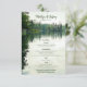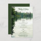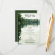 This rustic lakeside evergreens wedding details enclosure card, created from my own personal kayaking photograph and with a subtle digital watercolor effect, features a beautiful rustic scene under an overcast sky with lightly rippled but calm water reflecting distant evergreens, cedar trees and rock structures, perfect for a mountain, lakeside, or riverside wedding celebration - by katz_d_zynes