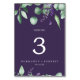 This rustic lavender and eucalyptus purple table number is perfect for a simple and elegant outdoor wedding. The floral design features watercolor eucalyptus leaves and greenery with sprigs of purple wildflowers on a plum purple background. The card prints on the front and back (double-sided). Add each table number that you need to your cart individually.