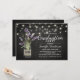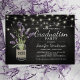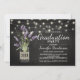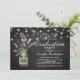Celebrate your graduate in effortless country chic style with this rustic yet elegant graduation party invitation. Featuring a black chalkboard background, the design is accented with twinkling string lights and a charming mason jar filled with purple lavender flowers, wrapped in burlap for a warm, farmhouse-inspired touch.
