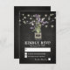 Country chic wedding response cards featuring a rustic black chalkboard background, string lights, a mason jar with purple lavender flowers, wrapped in burlap with the couples initials and a wedding rsvp template that is easily personalised.