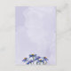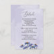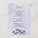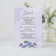 Theme Parties' pretty wedding details enclosure card design features pretty periwinkle / blue daisies bouquet set on a pastel lavender background with white watercolor swatches. Include your accommodations information, welcome reception details, and farewell event details here. #WeddingDetails #RusticWedding #PurpleDaisies