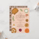 Rustic Thanksgiving party invitation card featuring illustration of thanksgiving dinner including a turkey, pie, and pumpkin.