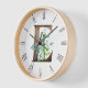 Wood framed wall clock features rustic wood letter E monogram with watercolor eucalyptus and lavender embellishment. Perfect for bedroom or Livingroom walls.
