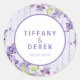 Lilac Wedding Classic Round Sticker with couple's names and wedding date.