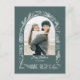 This unique design features a trendy arch-shaped photo template with a white line drawn winter botanical border on a sage green background.