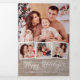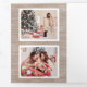 Trendy and festive multi-photo design featuring three small and one large template, custom decorative white "Happy Holidays" calligraphy script and editable text field on warm rustic linen texture background. Panels feature complementary script, linen background, photo templates and additional text fields.