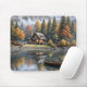 A cosy log cabin stands by the edge of a lake surrounded by vibrant autumn trees and towering mountains in the mist with rowboat