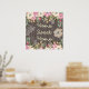 The background is a dark wooden plank effect (printed effect not real wood) and the words are surrounded by a decorative border of beautiful watercolor flowers in shades of pink, apricot, cream and peach. There are leaves in greens and gold colours and sprigs of white babies breath flowers.