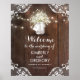 Barn wood, lace, string lights and mason jar with baby's breath flowers wedding welcome sign poster