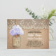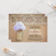 Cute rustic engagement party invitation featuring mason jar with light blue hydrangea blossom. Perfect invite for country engagement party with vintage lace and distressed wood accents.