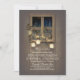Rustic country rehearsal dinner invitations with tree branches, mason jars, string lights, and old barn window.