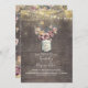 Vintage rustic baby shower invitation features mauve and gold floral mason jar, string of lights, and old barn wood background.