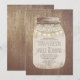 Rustic country rehearsal dinner invitation features vintage mason jar with old fashioned lace and string of lights. Romantic, distressed wood invite for your rustic barn rehearsal dinner.