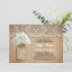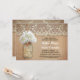 Cute rustic rehearsal diner invitation featuring mason jar with white hydrangea blossom. Perfect invite for country rehearsal dinner with vintage lace and distressed wood accents.