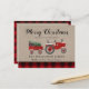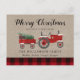 Rustic Merry Christmas Red Plaid Holiday Card - Wish your family and friends a Merry Christmas this holiday season with a touch of rustic, farmhouse style. Our unique country Christmas Card features a vintage farm tractor carrying a Christmas tree fresh from the farm and a gift all wrapped up for the holiday. (All text is editable). Merry Christmas is in a pretty, script font. Card is personalised with your family name and family member's names. Card is part of a collection. Shown with Kraft background. Card is also suitable for business.