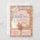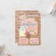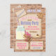 Rustic and pretty, Milk and Cookies Birthday Party Invitations with big mason jar of milk and straw, stack of cookies with ribbon, chocolate chip cookie with a bite taken out of it with vintage paper, fun typography on a rustic wood plank background. Hand drawn illustration by McBooboo.