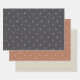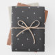 This minimalist Scandinavian style wrapping paper set features a trio of stylish designs, each featuring the same simple repeating white pine tree motif on muted backgrounds of charcoal black, terracotta brown, and beige grey. The understated elegance of the tiny tree pattern adds a touch of natural Nordic charm, perfect for creating a sophisticated, modern look. Whether you're wrapping gifts for the Christmas holidays, birthdays, or special occasions, this set offers a neutral yet festive palette that works beautifully for both formal and casual gift-giving. The combination of earthy tones and minimalist design brings a timeless, chic aesthetic to your presents.