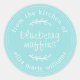 Rustic and modern customisable homemade baked goods blueberry muffins sticker with the text from the kitchen of, blueberry muffins and your name in modern script on a turquoise blue background. Simply customise this personalised baking gift sticker with your text, the product name and your name. Exclusively designed for you by Happy Dolphin Studio. If you need any help or matching products, please contact us at happydolphinstudio@outlook.com.