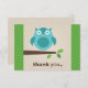 Blue owl on tree branch "Thank You" note cards.  Write your personal thank you note on the back of the card. Colours include turquoise blue, green, chocolate brown, taupe and powder blue.