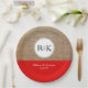 The design on this paper plate features a photo of textured burlap and is accented with a solid red stripe near the bottom. A white circle, on the burlap, features a black customisable monogram of the bride and groom. Customisable text, on the red part of the plate, features the names of the bride and groom and their wedding date.