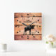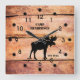 Personalise this rustic wood look wall clock design with your own text. Acrylic wall clock is printed in a cedar look plank style pattern accented with a black silhouetted moose. Would fit especially great into any mountain cabin, hunting camp lodging or man-cave decor. Available in your choice or round or square faces.