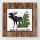 This rustic style wall clock has a wood grain border with a moose silhouette in the center long with woodsy trees and grasses. There is a space for your family name. Buy this clock for yourself or give it as a housewarming gift or another gift for him.