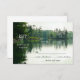 Rustic mountain lake wedding RSVP card features a beautiful rustic lakeside scene with distant evergreens, trees and rock structures reflecting on calm, slightly rippled water under an overcast sky | this image is my own photograph taken while kayaking, enhanced with a subtle digital watercolor effect for a painterly feel - part of the Mountain Lake Rustic Wedding Collection by katz_d_zynes >> https://www.zazzle.com/collections/119499271518309609