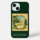 A vintage rustic image; a circular vignette featuring mountains and conifer trees with snow in the branches surrounded by a floral motif. Customise by adding your own text.