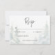 Escape to a serene mountain retreat with your wedding response card without dinner choice options. This exquisite design showcases a breathtaking watercolor painting of a majestic snow covered pine tree forest on a serene snow covered sloping landscape . The muted natural tones of greens, teal blues, and greys create a timeless and sophisticated atmosphere, reminiscent of a peaceful alpine escape. The clean white background and modern font text add a touch of contemporary elegance, balancing the natural beauty of the scene. This design will not only announce your special day but also set the perfect tone for a truly memorable celebration, inviting your guests to join you on a journey of tranquillity and love. Created by Simply Farmhouse Press.