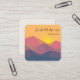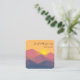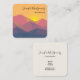 A business card with a graphic illustration featuring many mountain tops with bright yellow sunlight setting behind the mountains. Made with geometric polygonal shapes.Simple minimalist design. Colours range from dark blue to desert red.
