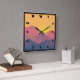 A clock with a graphic illustration featuring many mountain tops with bright yellow sunlight setting behind the mountains. Made with geometric polygonal shapes.Simple minimalist design. Colours range from dark blue to desert red.