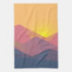 Kitchen towel with a graphic illustration featuring many mountain tops with bright yellow sunlight setting behind the mountains. Made with geometric polygonal shapes.Simple minimalist design. Colours range from dark blue to desert red.