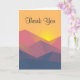 Thank you card with a graphic illustration featuring many mountain tops with bright yellow sunlight setting behind the mountains. Made with geometric polygonal shapes.Simple minimalist design. Colours range from dark blue to desert red.