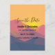 Save the date wedding postcard with a graphic illustration featuring many mountain tops with bright yellow sunlight setting behind the mountains. Made with geometric polygonal shapes.Simple minimalist design. Colours range from dark blue to desert red.
