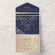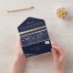 This elegant navy and gold all-in-one invitation brings rustic romance to life with glowing string lights and golden floral accents. A convenient foldable format with RSVP and mailing panel—no envelope required. Perfect for winter weddings, barn receptions, or chic evening celebrations with a cosy touch.