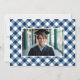 "Backyard BBQ" party invitation features a photo of the graduate with graduation cap motif, stylish custom text in rustic and modern fonts, a scroll, and plaid pattern design elements, and white text. The dark navy blue background and gingham tablecloth plaid pattern on the back of the card can be customised. Perfect for a casual outdoor summer graduation party.