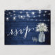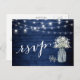 Create your own RSVP Card with this "Rustic Navy Blue Baby's Breath Mason Jar String Lights RSVP Postcard" template to match your wedding style, colours and theme. It's easy to customise to match invitation cards!