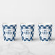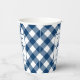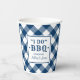 "I do" BBQ wedding paper party cups feature a rustic navy blue and white gingham tablecloth plaid patterned background with custom text for the bride and groom couple's first names that can be personalised. Perfect for a casual summer backyard wedding event.