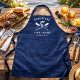 This all over print family lake house apron features crossed oars and a jumping fish on a navy blue wood background, with family name, lakehouse location, and established date as easy to personalise text templates.