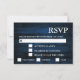 Rustic wedding RSVP card with a navy blue wood background with string lights. The date to RSVP by has a labelled text box to help you customise it for your day.