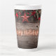 Festive and rustic design featuring a top Christmas themed garland border, dark wood background and "Happy Holidays" in neon text.