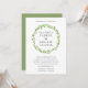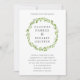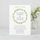 Rustic wedding invitation with a large wreath comprised of green olive leaves. Inside of the wreath are your first and last names in all caps in a serif font. Below are your details in a medium grey font. The backside is a matching shade of green and may be changed to any colour that you wish. This design is perfect for a summer wedding.