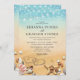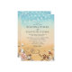 Tropical beach destination wedding invitations featuring a rustic ombre yellow to watercolor blue background, starfish, seashells, string lights, two hearts in the sand with your initials, and an elegant wedding template that is easy to personalise.
