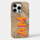 Rustic Orange and Hot Pink Shadow Monogrammed Personalised Vertical Big Initial Light Coloured Wood Texture Pattern iPhone 16 Pro Case - This trendy light wooden texture patterned phone case has large orange and hot pink vertical shadow monogram on the side which you can customise to make this phone one of a kind and truly yours.