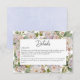 This simple but elegant wedding details card design features a beautiful hydrangea floral background of dusty pink, soft periwinkle blues and purples with greenery. The text is displayed on an arched white background, and the design is completed with the first initial of the bride and groom. This design is part of the Rustic Pastel Hydrangea Floral Monogram wedding suite of cards. Created by Simply Farmhouse Press.