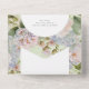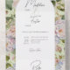 ALSO AVAILABLE WITH A QR CODE TO SCAN IN THE RSVP AREA OR WITHOUT DINNER SELECTION OPTIONS. This simple but elegant wedding invitation design features a beautiful hydrangea floral background of dusty pink, soft periwinkle blues and purples with greenery on a sage green background. The text is displayed on an arched white background. Created by Simply Farmhouse Press.